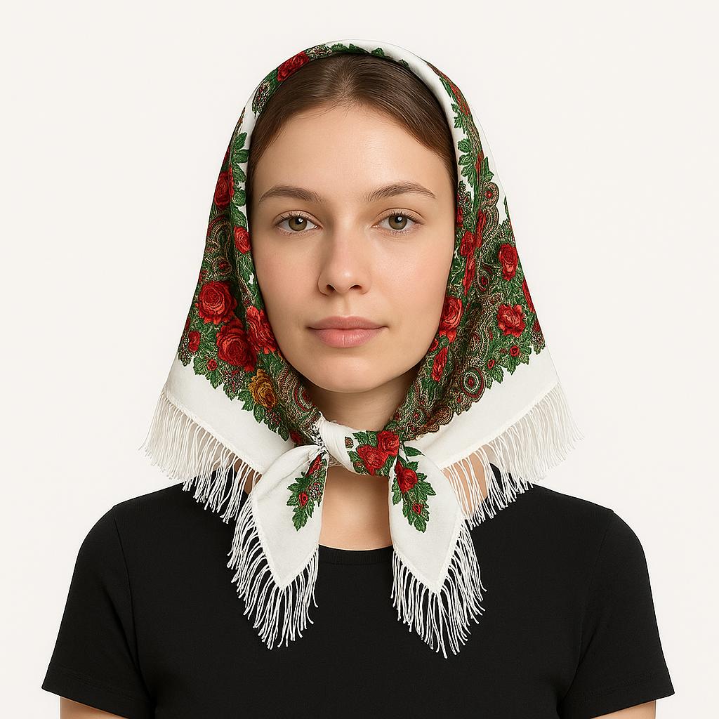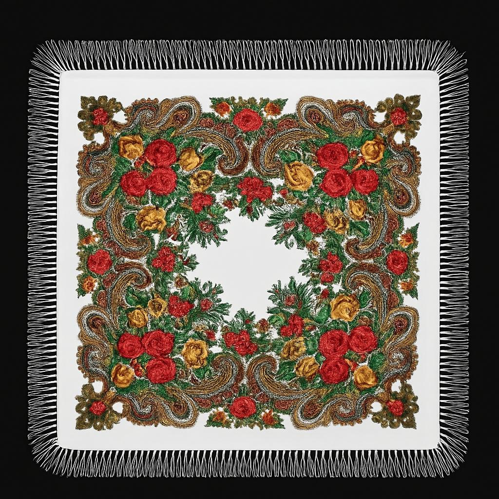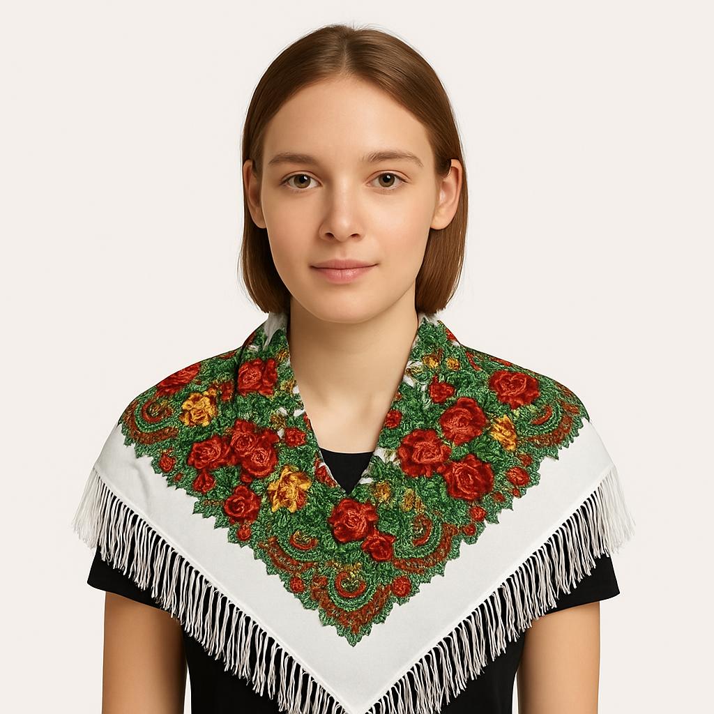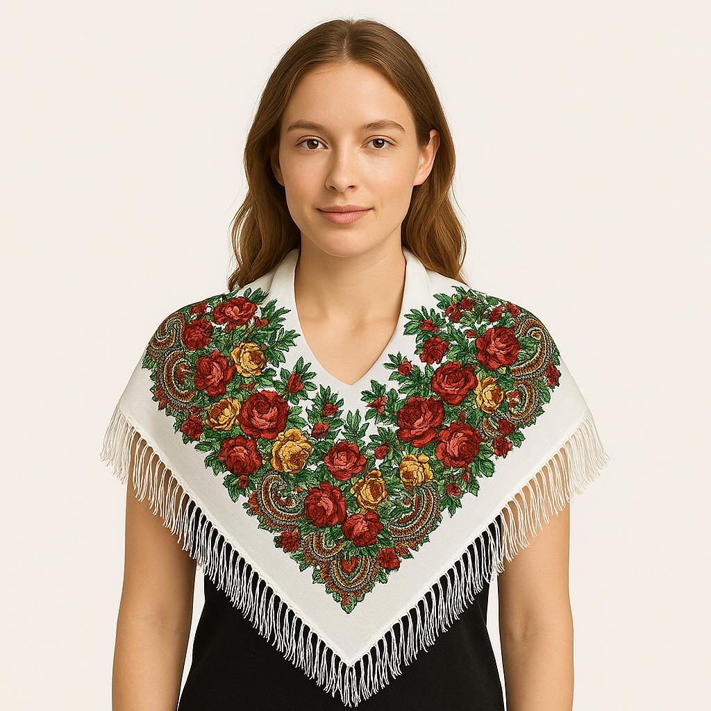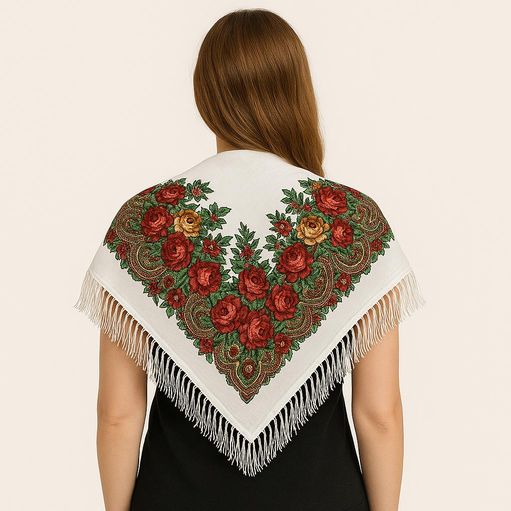 Fundalul alb luminos pune în valoare imprimeul floral spectaculos, cu trandafiri roșii și galbeni, însoțiți de detalii paisley fine în nuanțe aurii și verzi. Franjurii eleganți completează perfect designul, adăugând un aer clasic și rafinat.