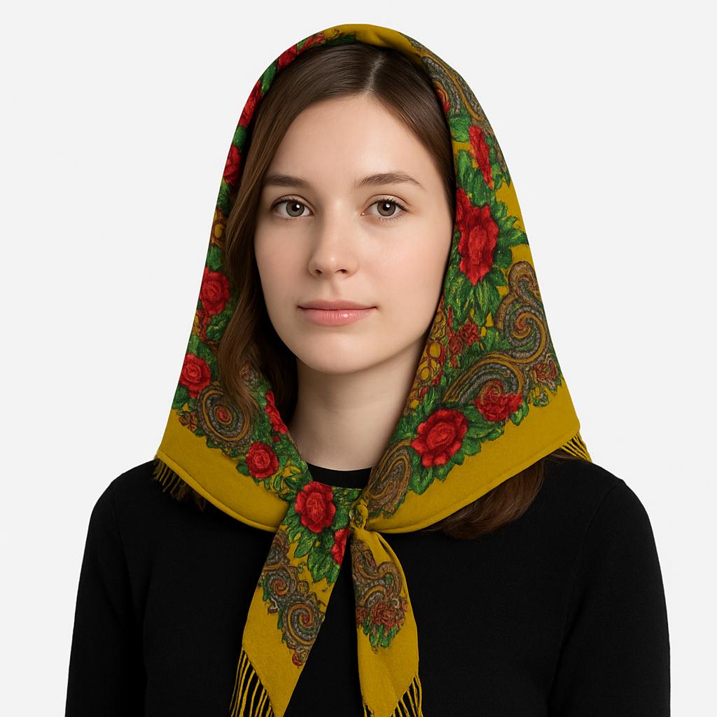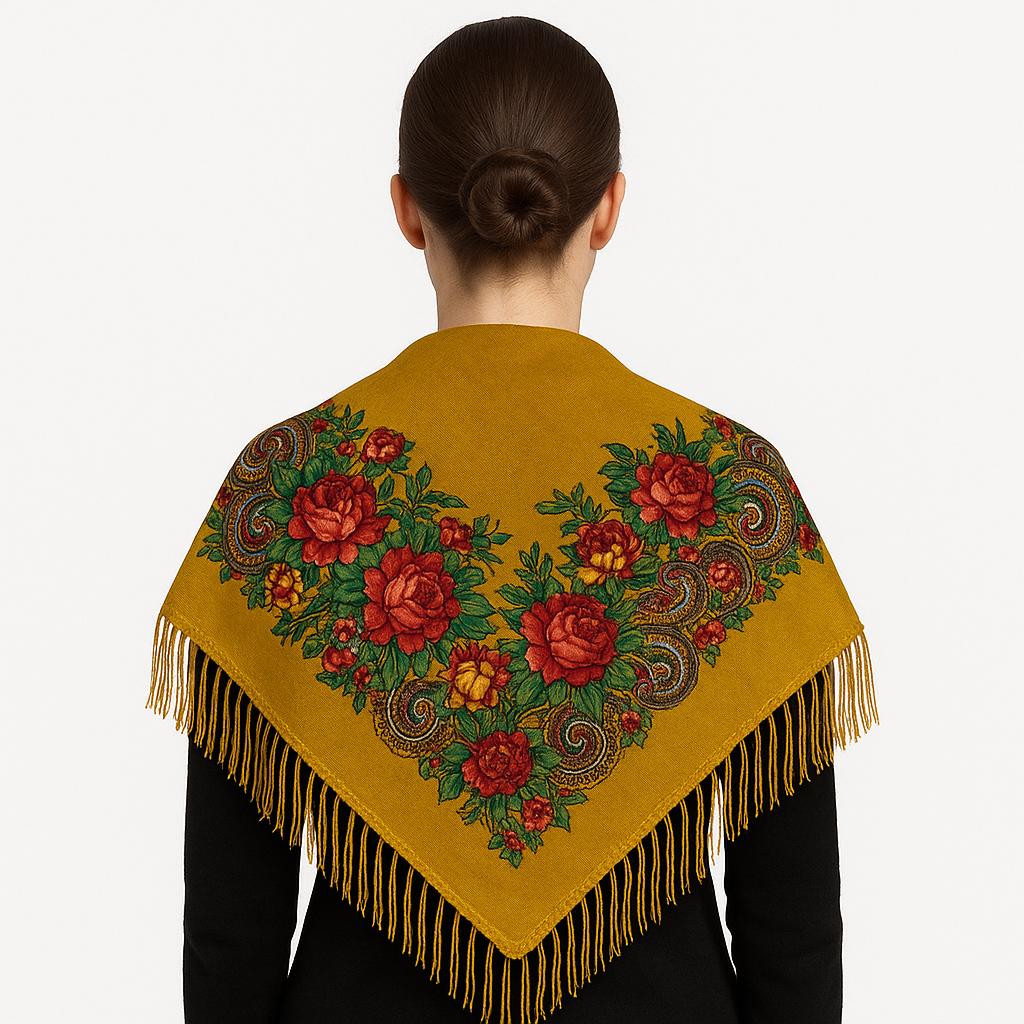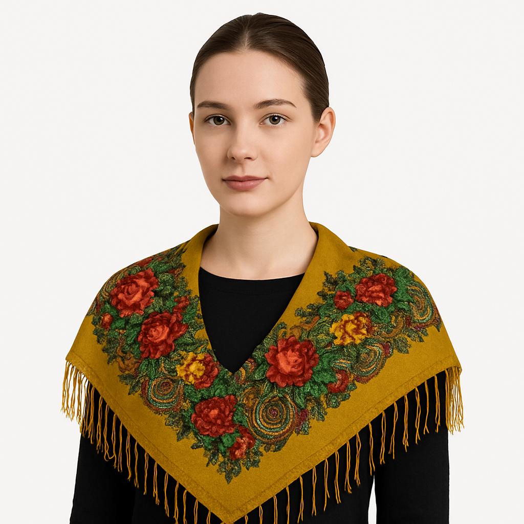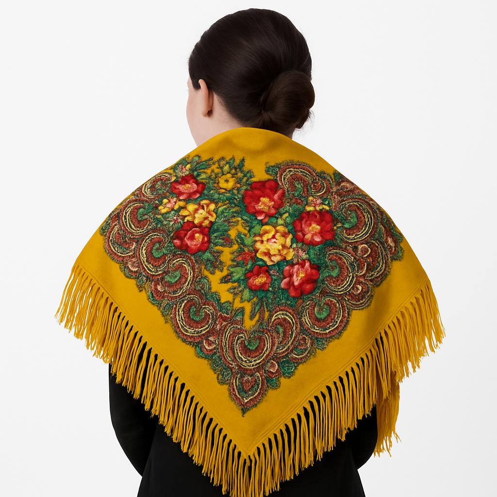 Acest batic din cașmir 95×95 cm cu fundal galben-muștar este un accesoriu vestimentar premium, care adaugă un plus de rafinament oricărei ținute. Realizat din cașmir moale și călduros, baticul se remarcă prin imprimeul floral spectaculos, cu trandafiri roșii și galbeni, înconjurați de detalii paisley aurii și franjuri subțiri ce conferă un finisaj elegant.