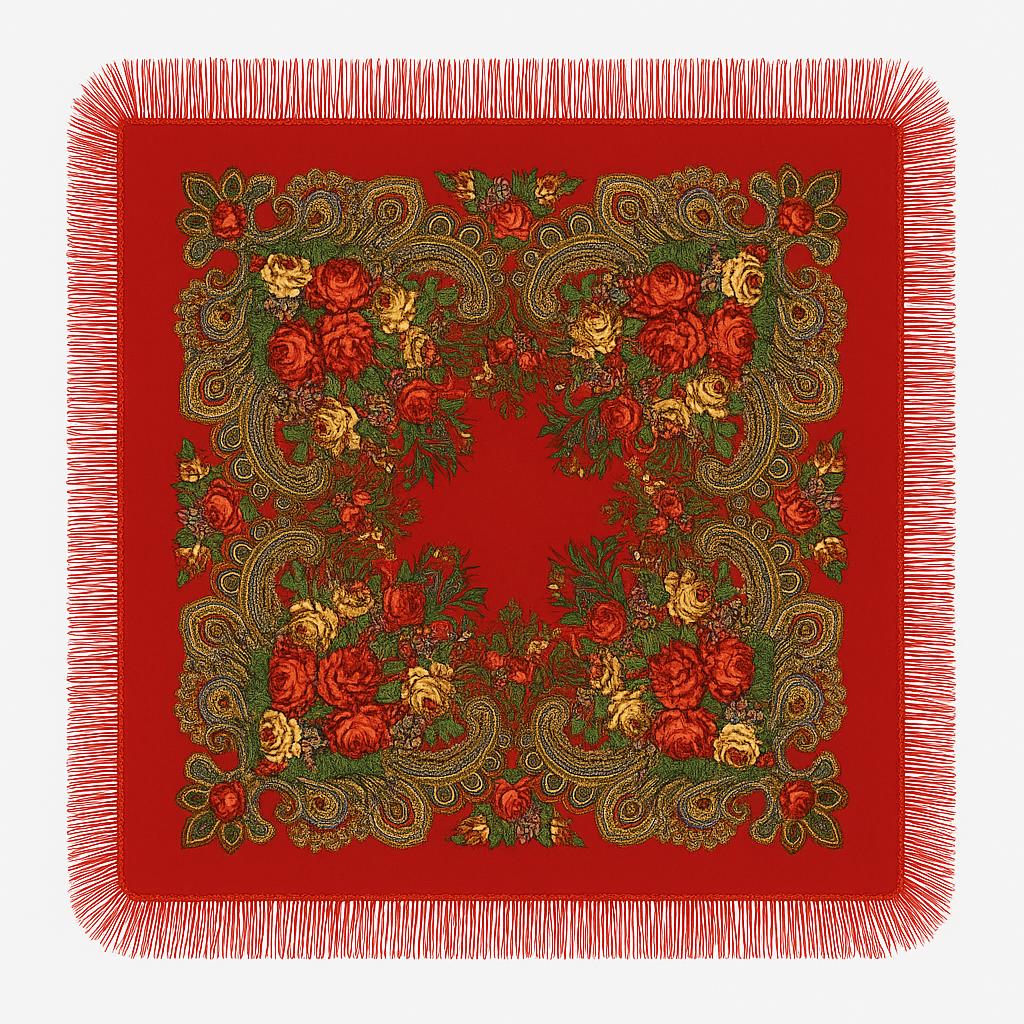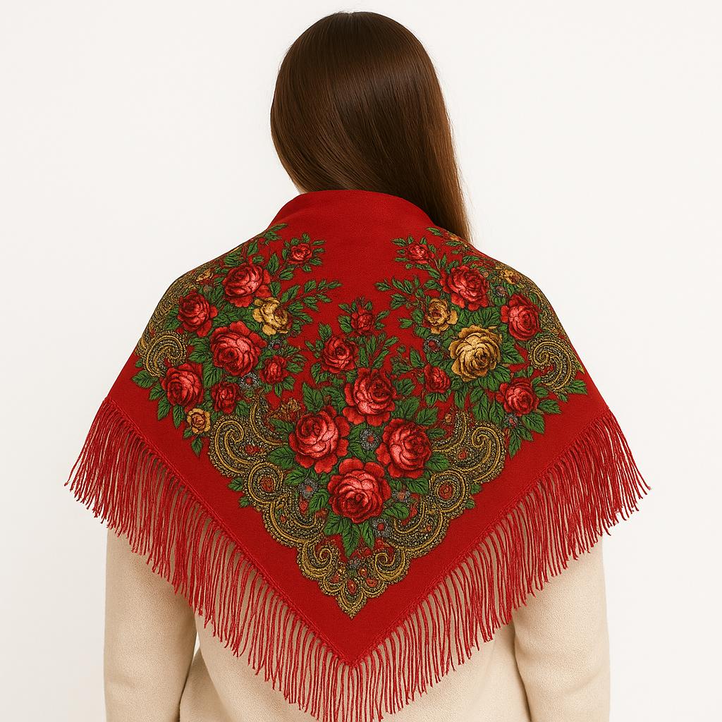Fundalul roșu vibrant pune în evidență motivele florale spectaculoase, cu trandafiri roșii și galbeni, completate de detalii paisley aurii și franjuri eleganți. Este un accesoriu extrem de versatil, potrivit pentru a fi purtat pe umeri, la gât sau pe cap, adăugând un accent rafinat oricărei ținute.