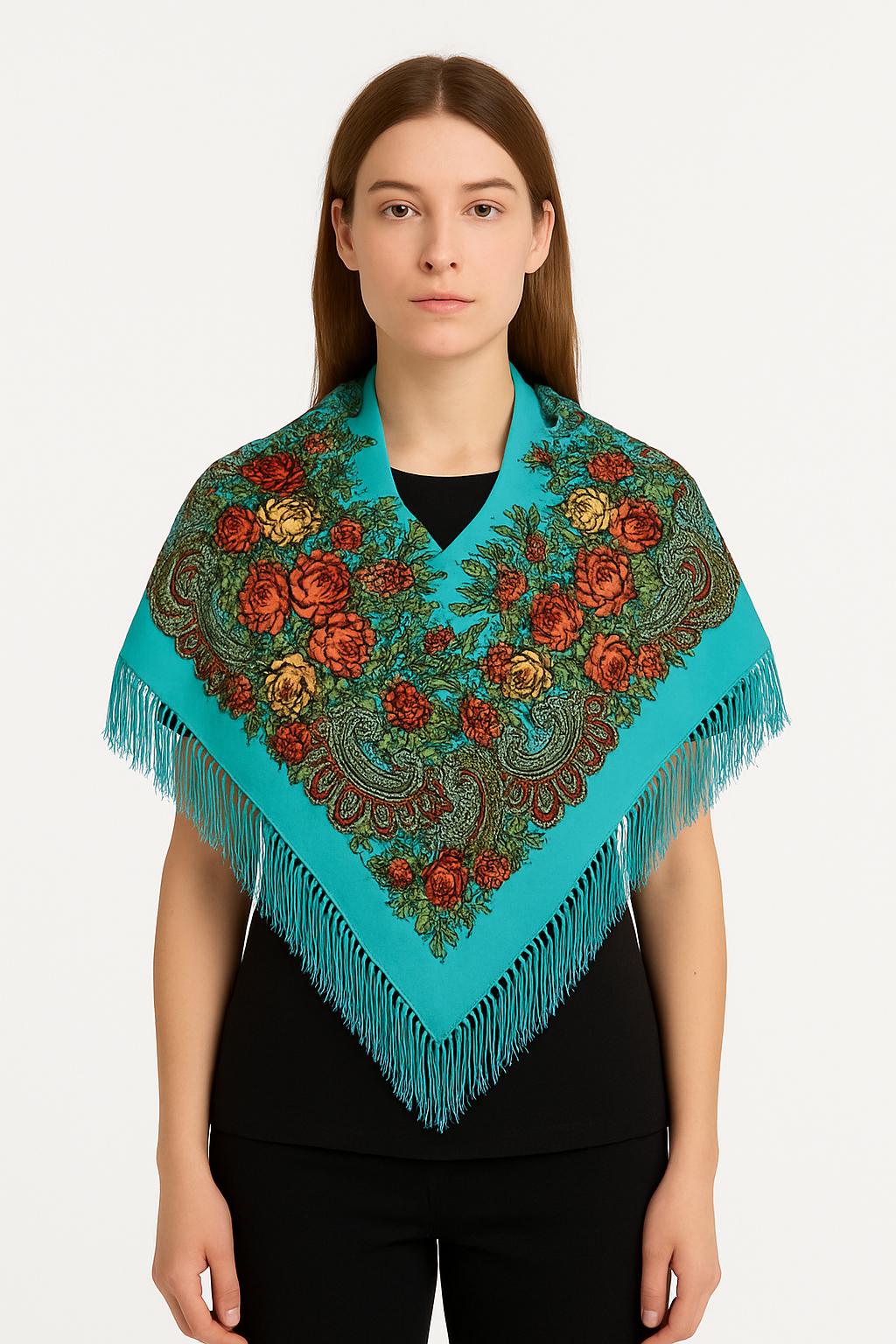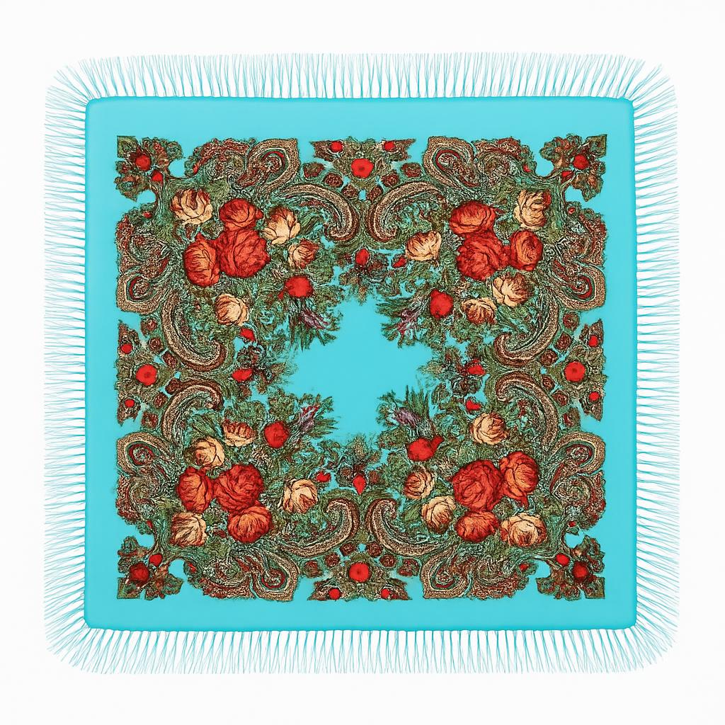 Fundalul turcoaz vibrant scoate în evidență imprimeul floral spectaculos, cu nuanțe bogate de roșu și bej, completat de detalii paisley aurii și verzi. Franjurii subțiri și eleganți adaugă un plus de rafinament, transformând baticul într-o piesă cu adevărat premium.