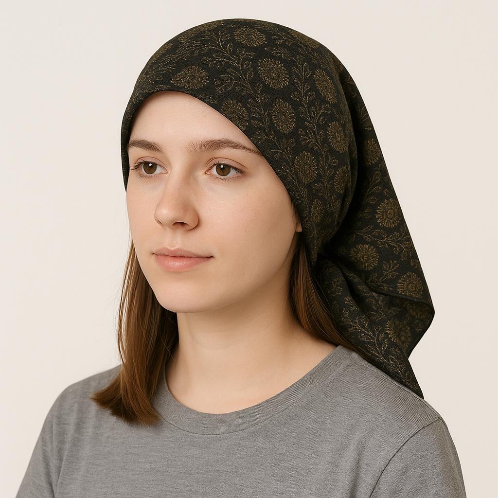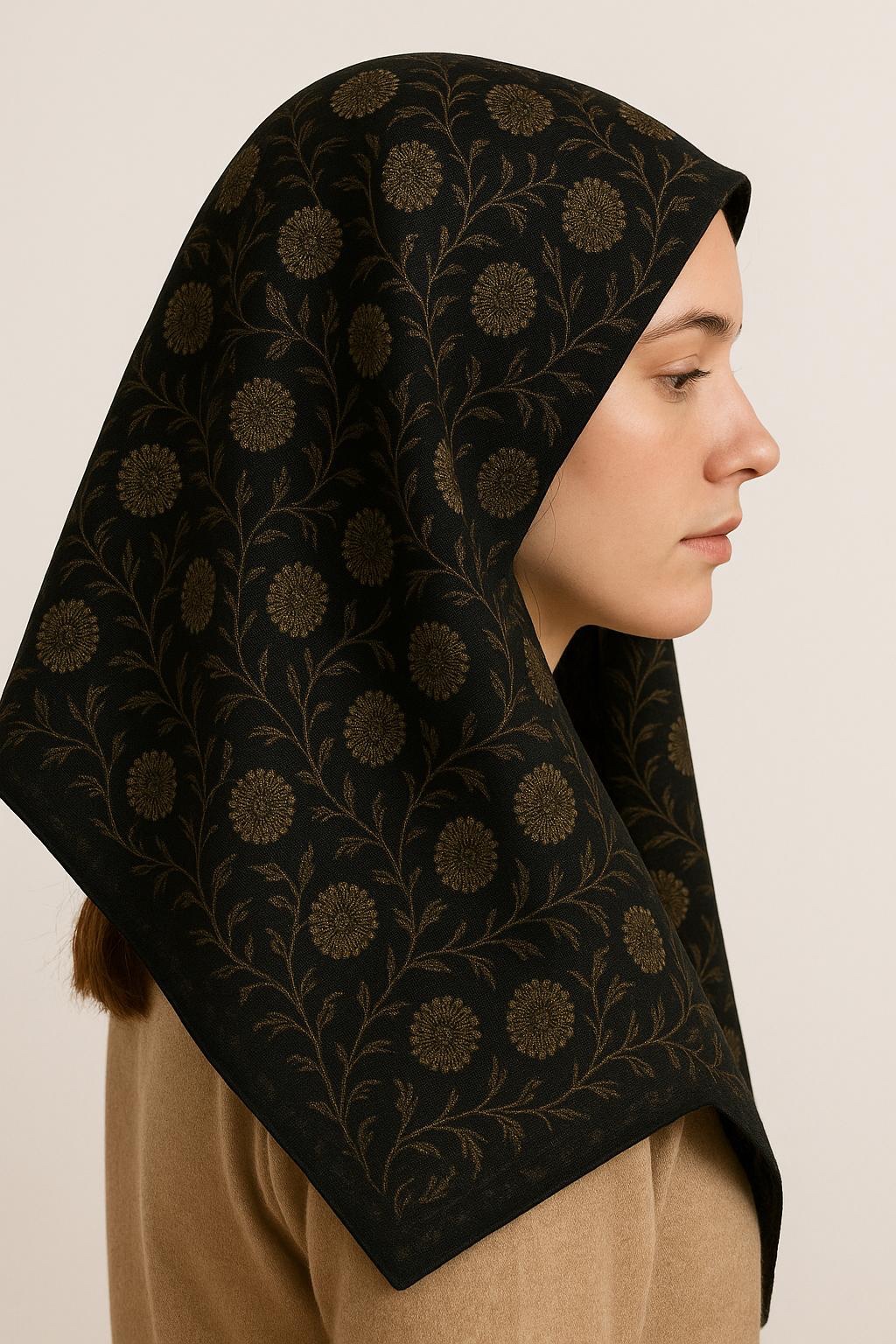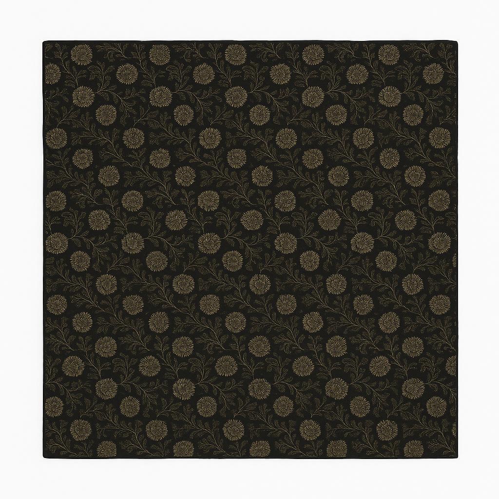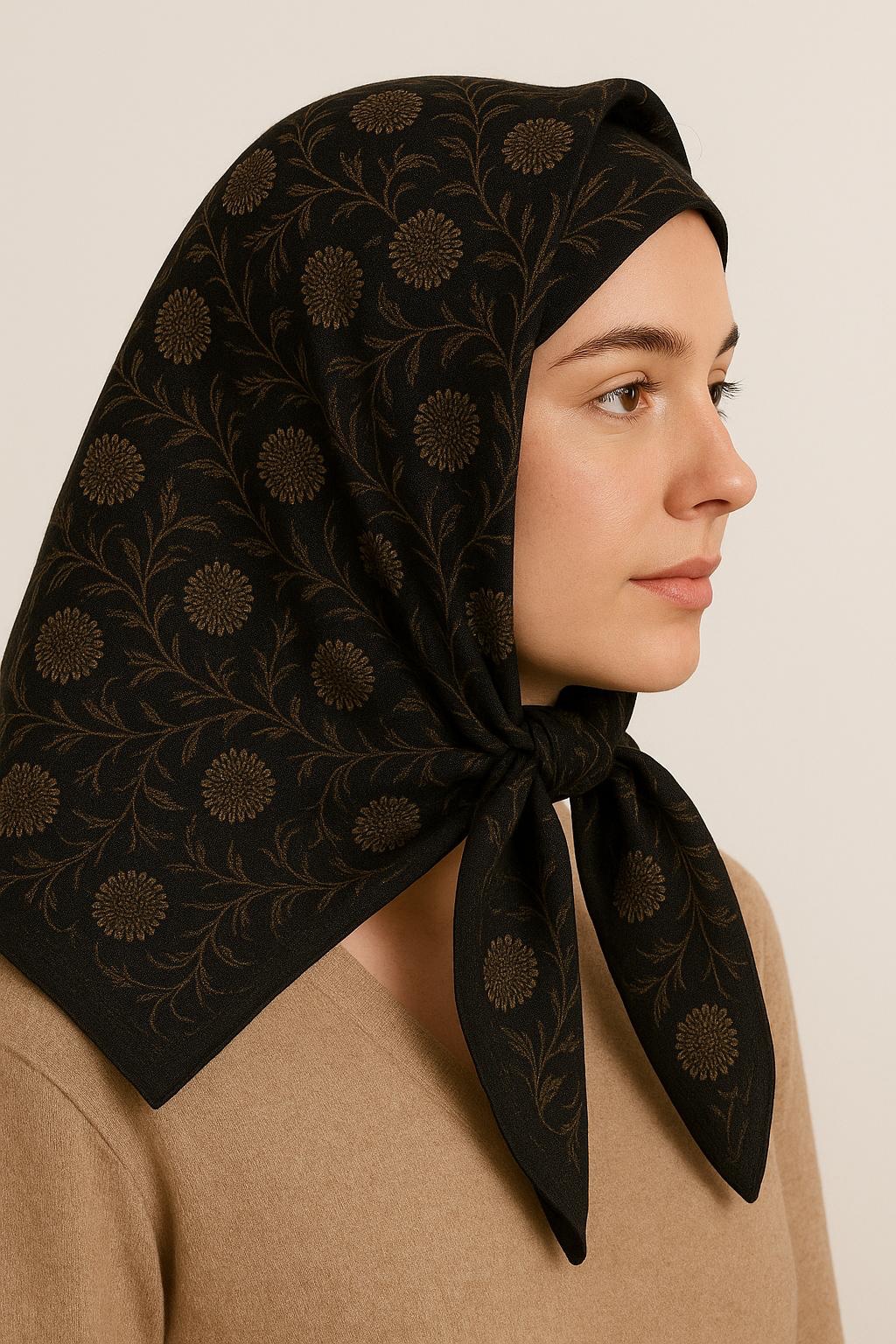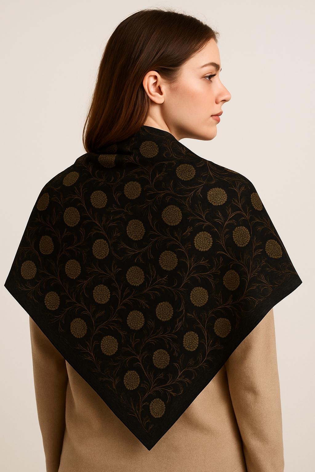 Acest batik din vâscoză, cu dimensiunea de 85×85 cm, îmbină rafinamentul clasic cu accente moderne. Fundalul negru pune în valoare imprimeul floral elegant, realizat în tonuri aurii subtile, care adaugă un plus de stil și finețe.
